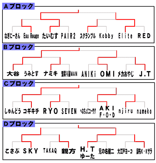 各ブロックの優勝者、準優勝者8名が決勝トーナメントに進出し、